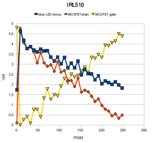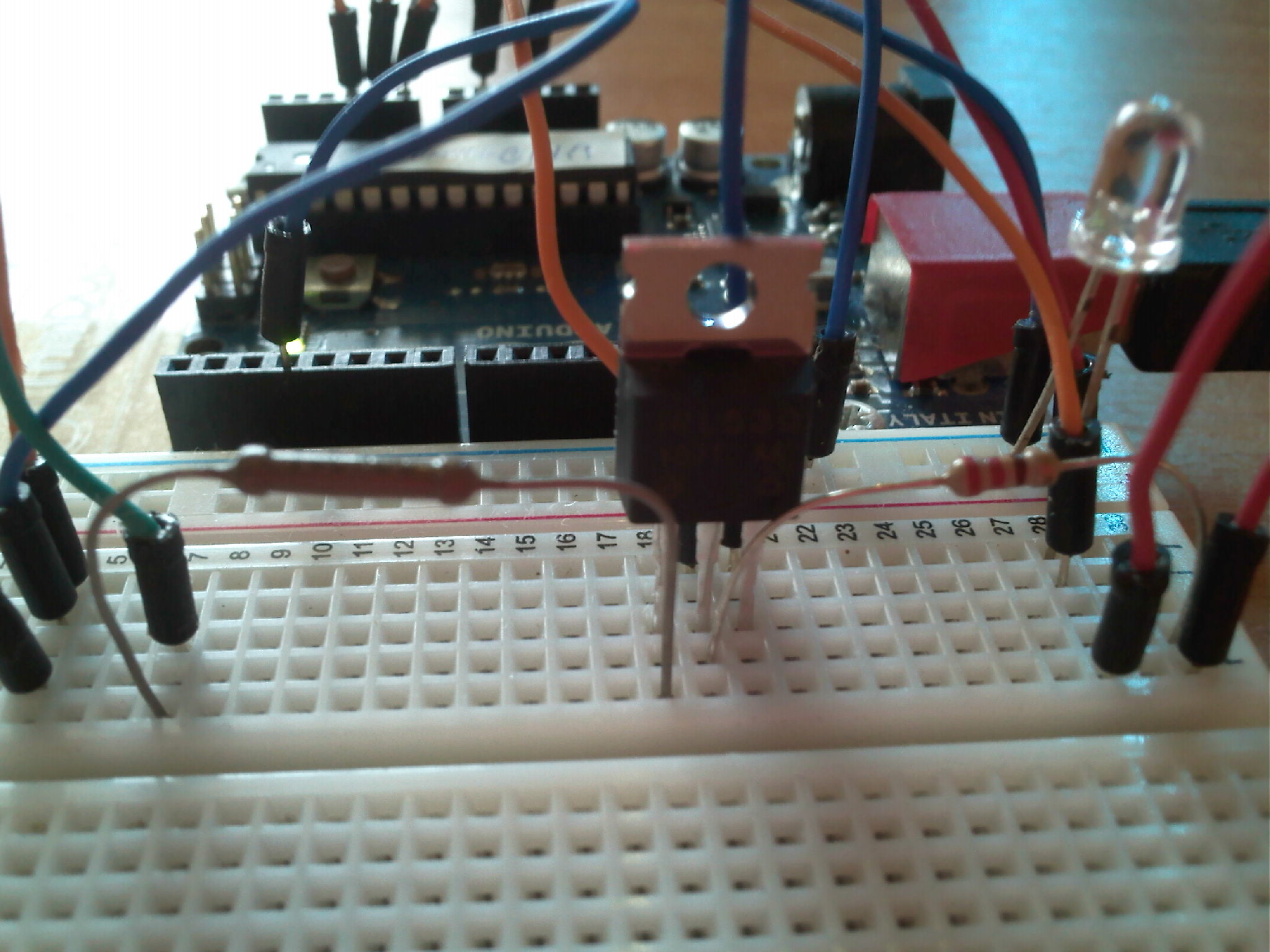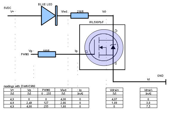 and as hardware first only one blue LED, a 220ohm resistor, and the MOSFET (15A) IRL530PbF