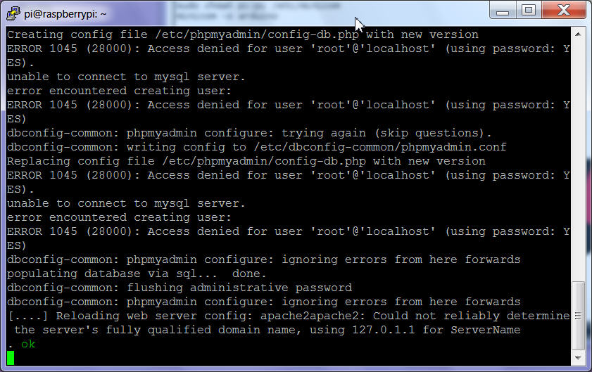 sudo apt-get install mysql-server mysql-client php5-mysql error connection failed
