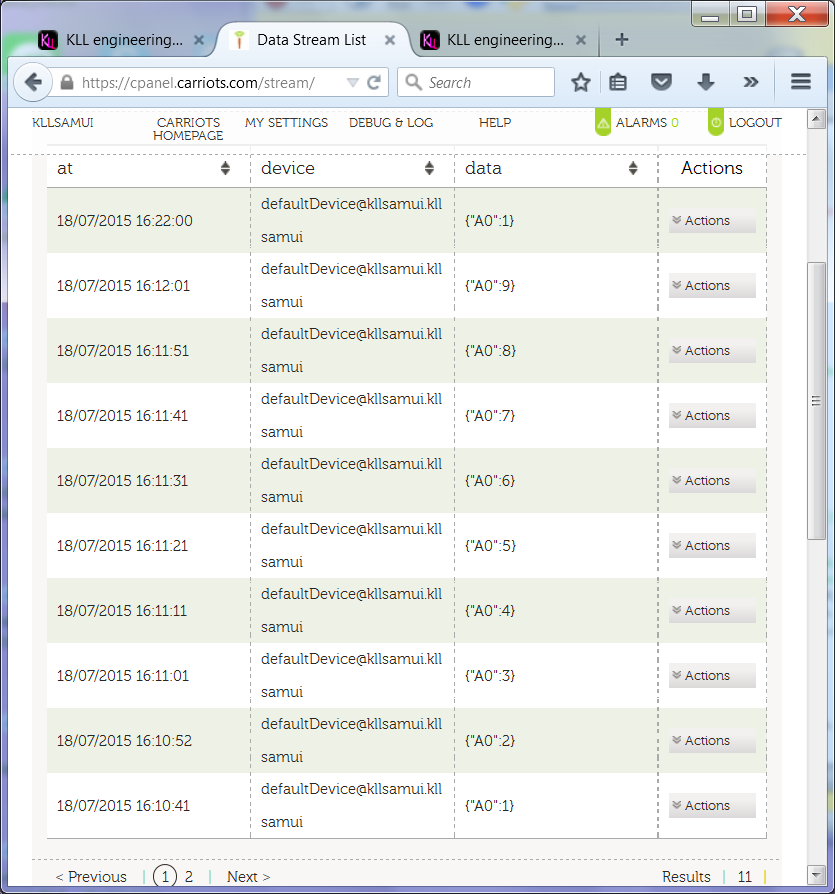 with this data storage code "at":"now" the CARRIOTS server makes the timestamp, arduino, serial link, RPI not need to waste time on "time".