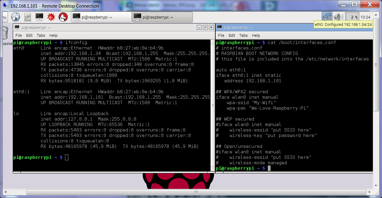 you can login headless via MS Remote Desktop Connection by 192.168.10.101 and "pi" "raspberry"